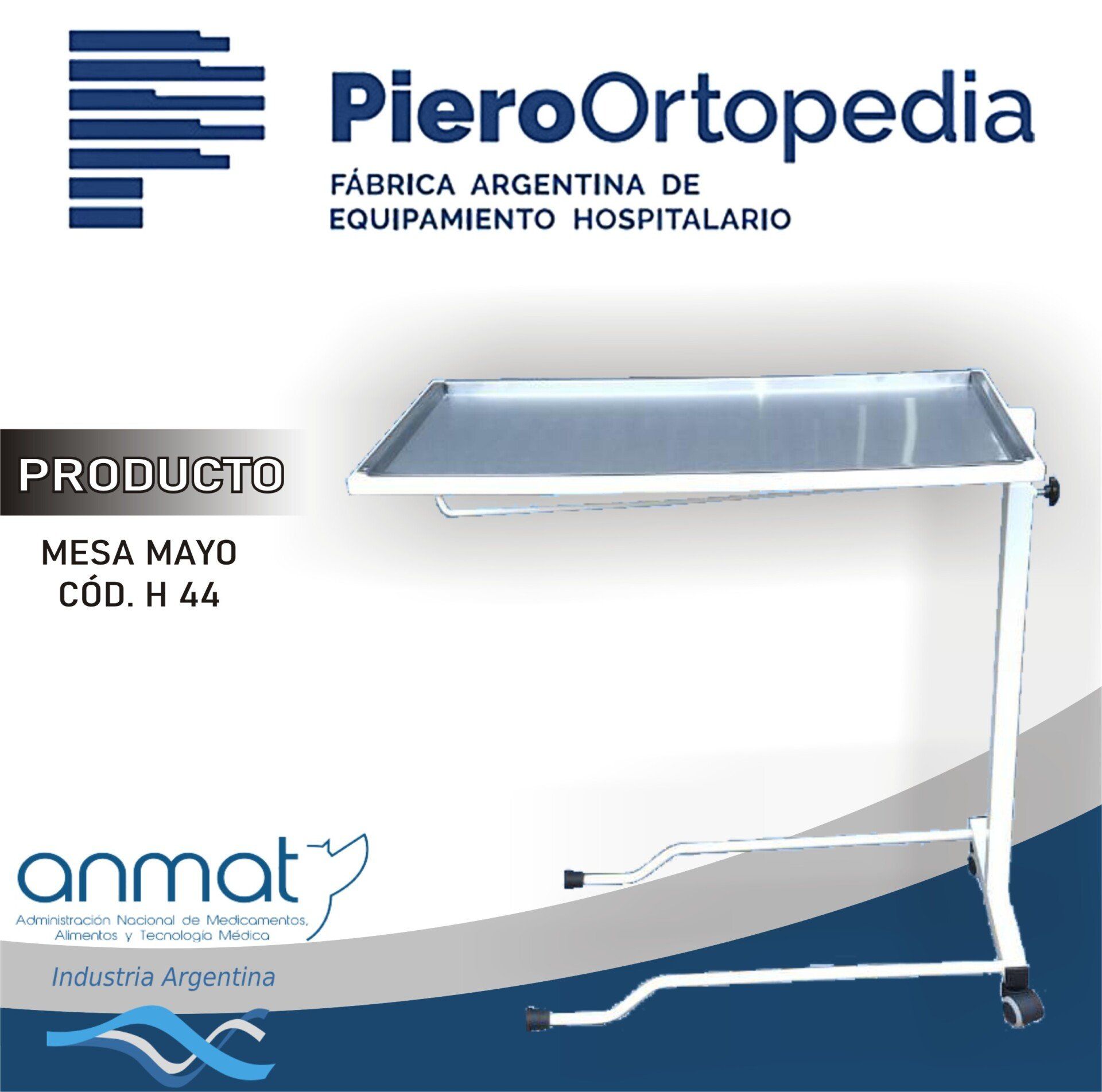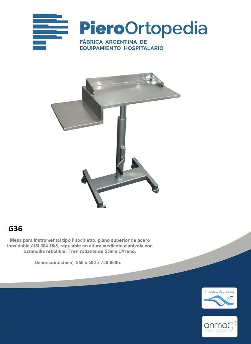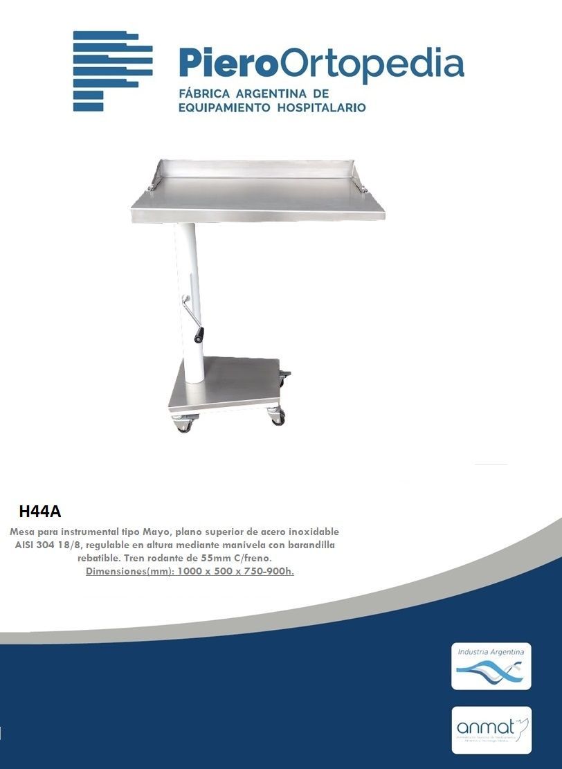 Mesa para instrumental tipo Mayo, regulable en altura mediante perilla, plano superior desmontable de acero inoxidable AISI 304 18/8. Tren rodante de 55mm de diámetro