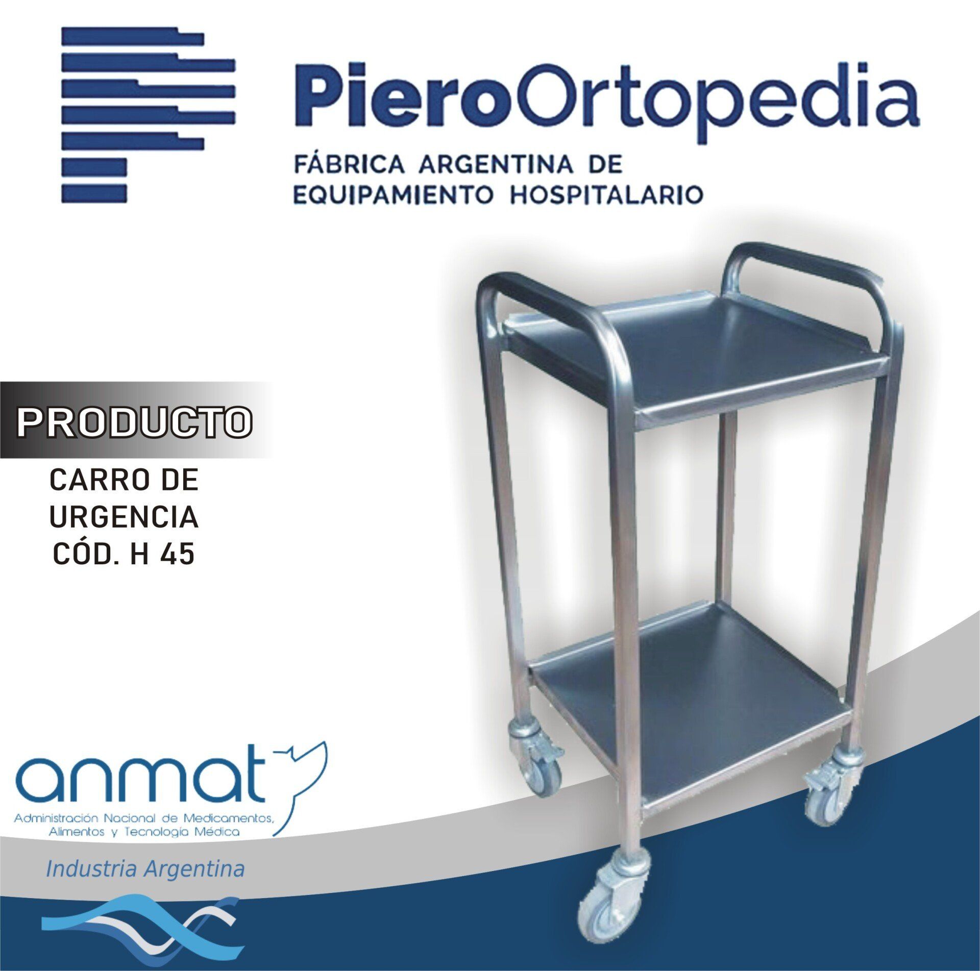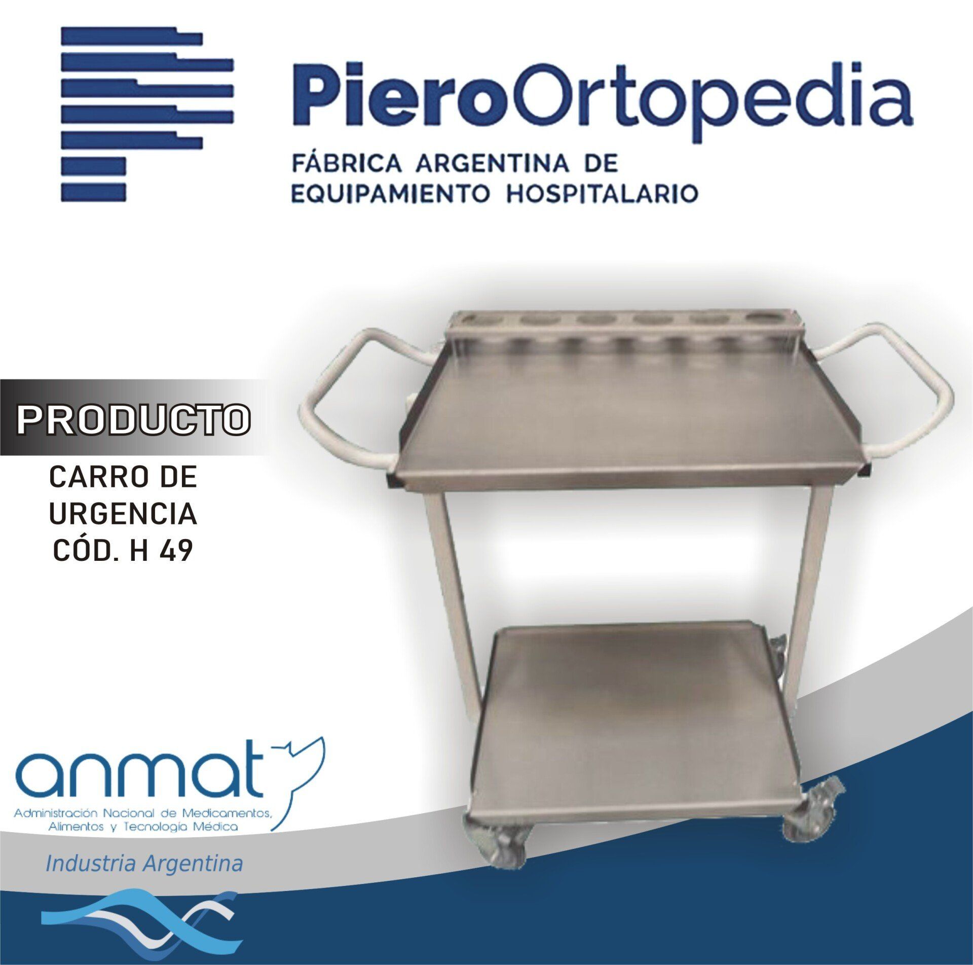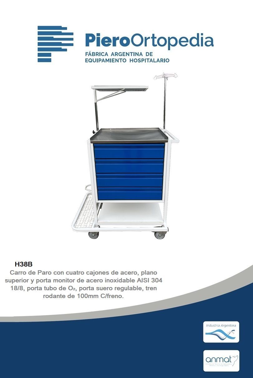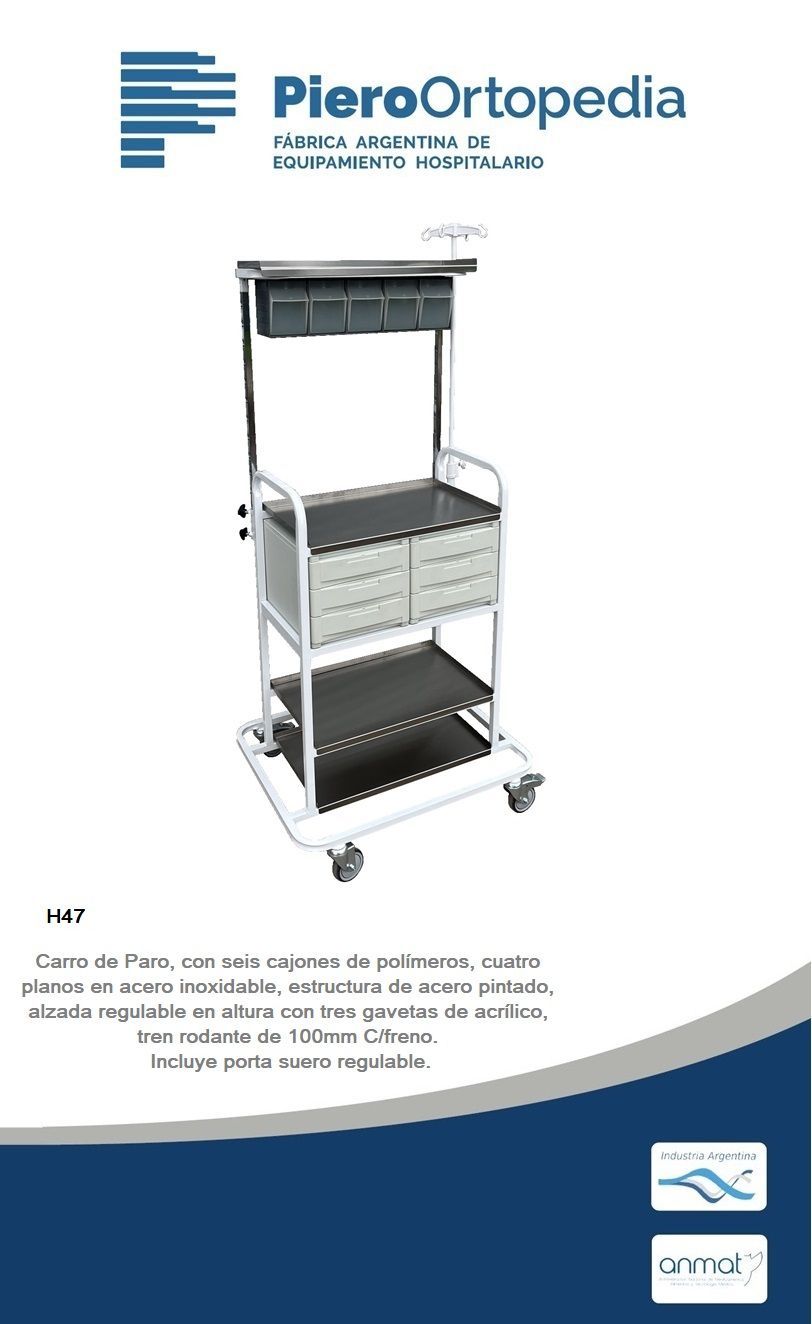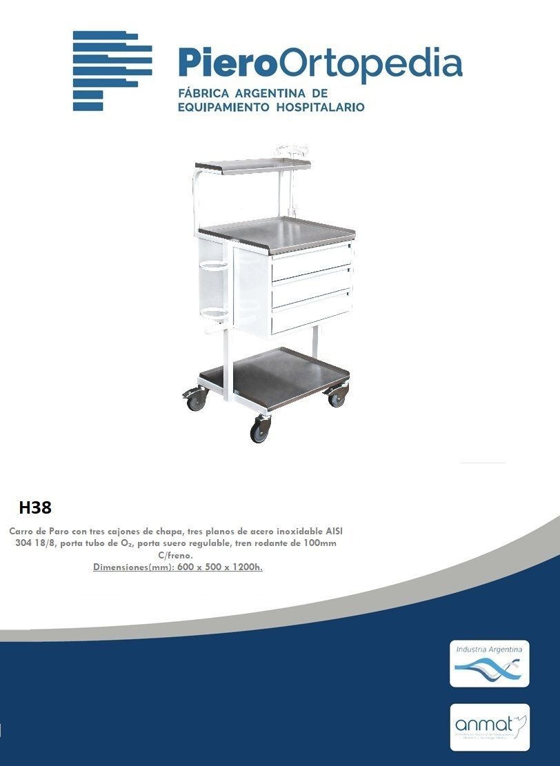 Carro para anestesia, estructura metálica pintada con manijones de empuje, dos planos y porta ondinas de acero inoxidable AISI 304 18/8. Tren rodante de 100mm C/freno.